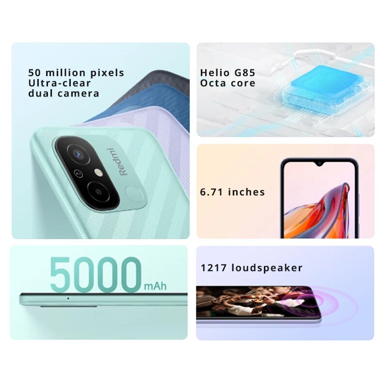 redmi 12c ocean blue (22126rn91y), 17,04 см (6.71") 20:9 1650 x 720 пикселей, 2,0 ггц+1,8 ггц, 8 core, 3 gb, 64 gb, 50 мп+5 мп/5 mp, 2 sim, 2g, 3g, lte, bl v5.1, wi-fi, nfc, gps / a-gps, глонасс, galileo, beidou, micro-usb, 5000 mah, 192g, 168,8 ммx76,4