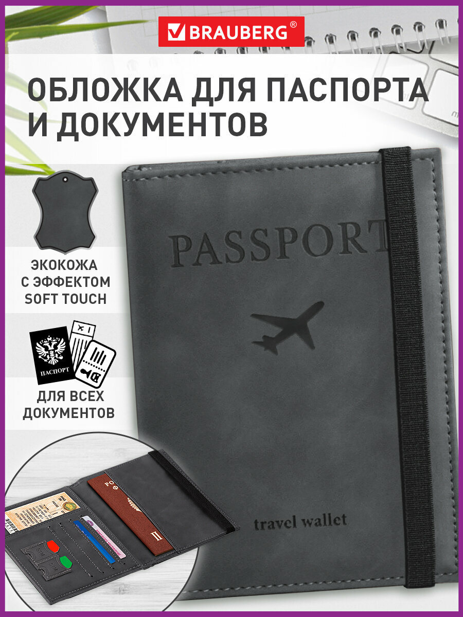 Обложка для паспорта с карманами и резинкой, мягкая экокожа, "PASSPORT", серая, BRAUBERG, 238203 550 ₽
