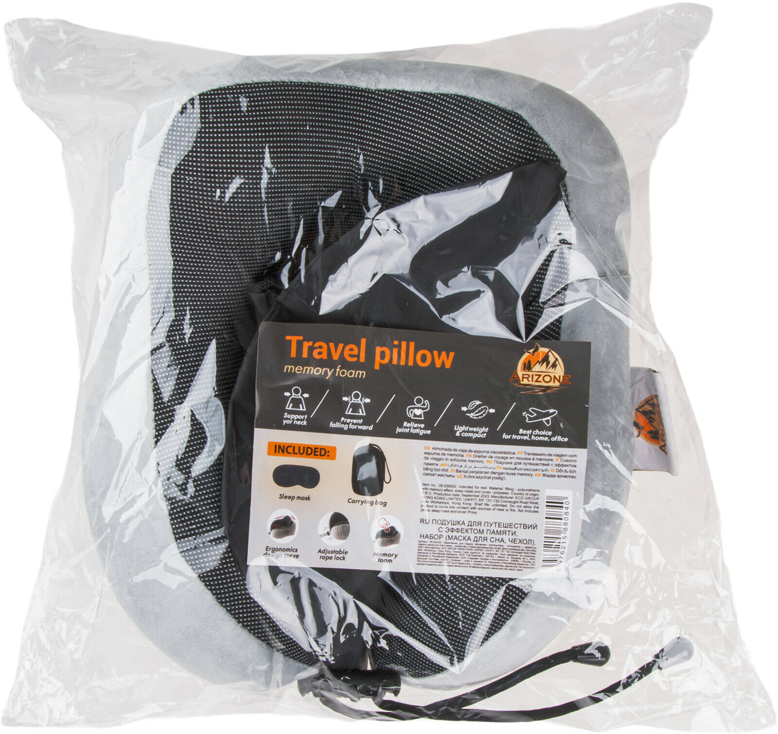 Подушка для путешествий с эффектом памяти, набор (маска для сна, чехол), черный, ARIZONE (28-200001) 1 170 ₽