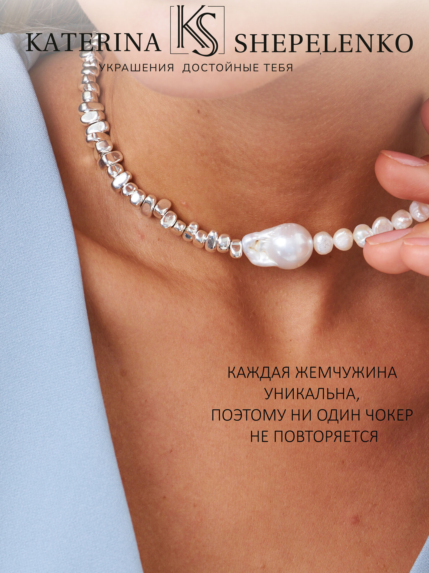 Отзывы на Чокер KATERINA SHEPELENKO, жемчуг культивированный, жемчуг барочный, жемчуг пресноводный, жемчуг пресноводный культивированный, гематит, длина 36 см, серебряный, белый, серый