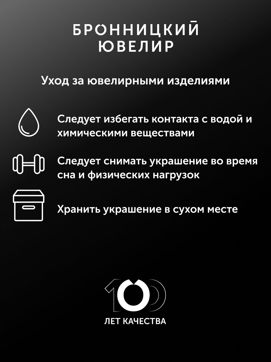 | Дополнительная информация | Значение веса на фото и в характеристиках являются примерными и могут отличаться от фактического. Чтобы украшение радовало Вас своей красотой бесконечно долго, рекомендуем избегать попадания на него агрессивных химических и парфюмированных средств. |