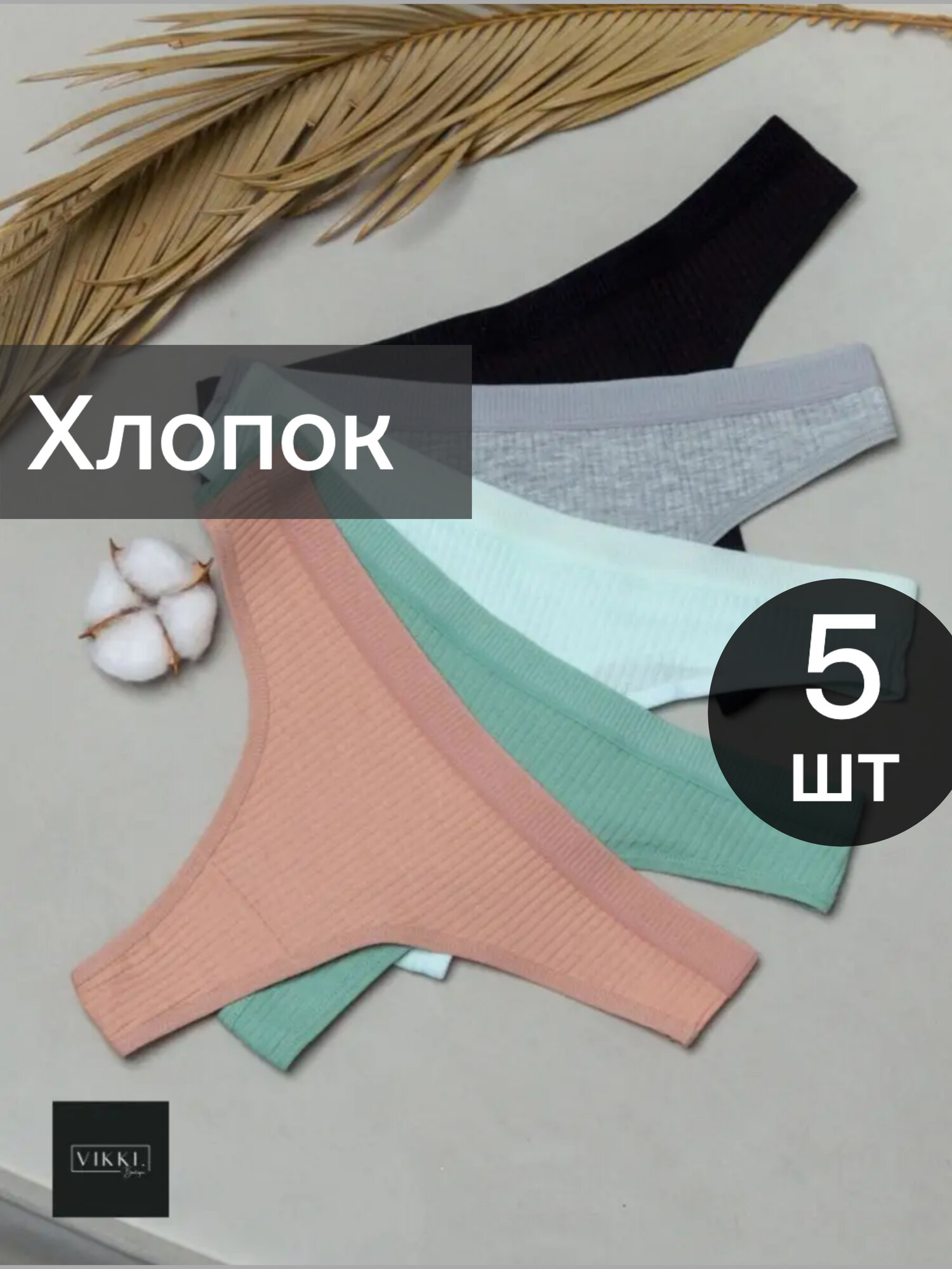 Набор трусы женские в рубчик стринги хлопок 5 штук 44-46, Цвет: черный, серый, мятный, зеленый, светло-коричневый