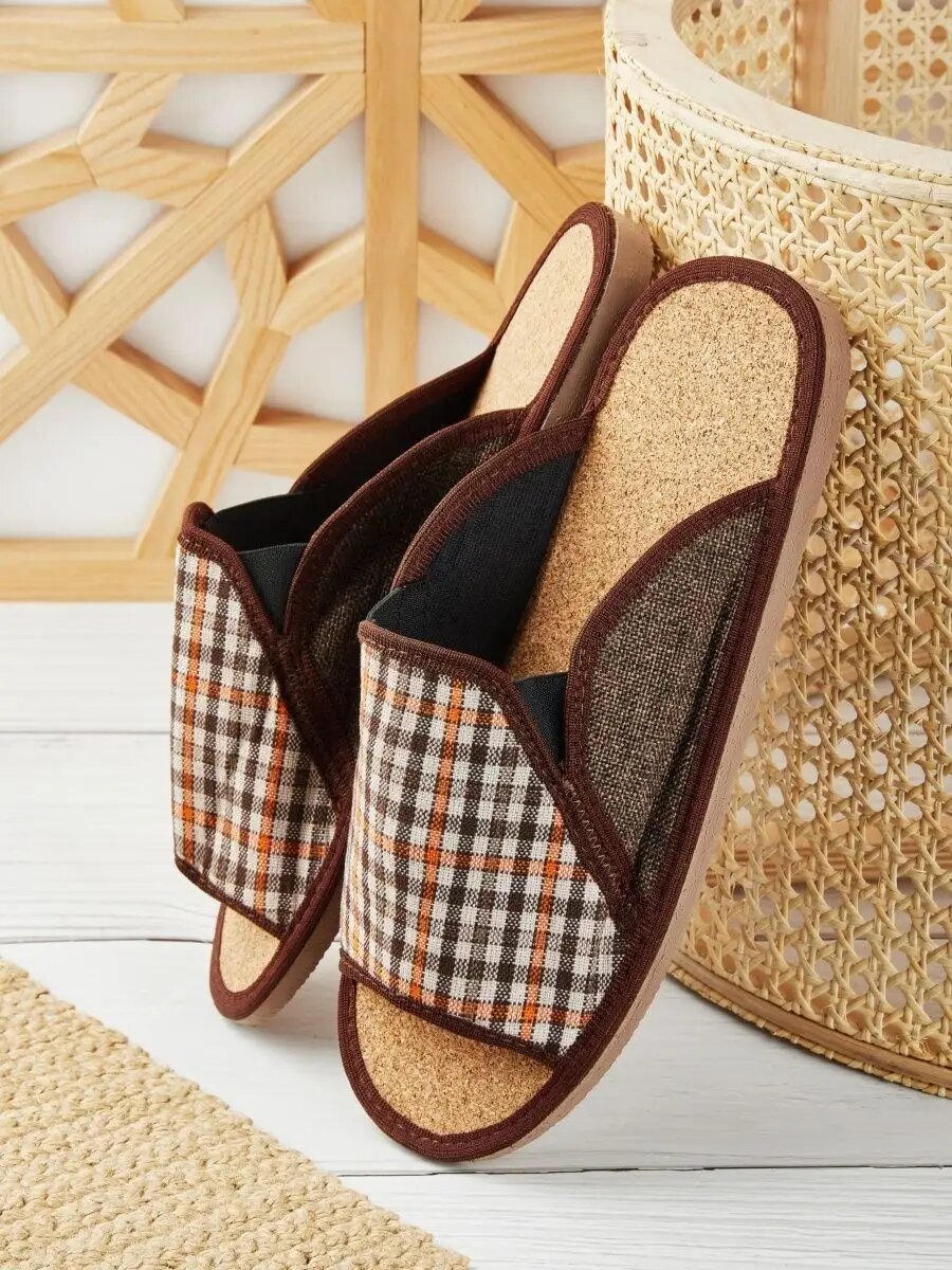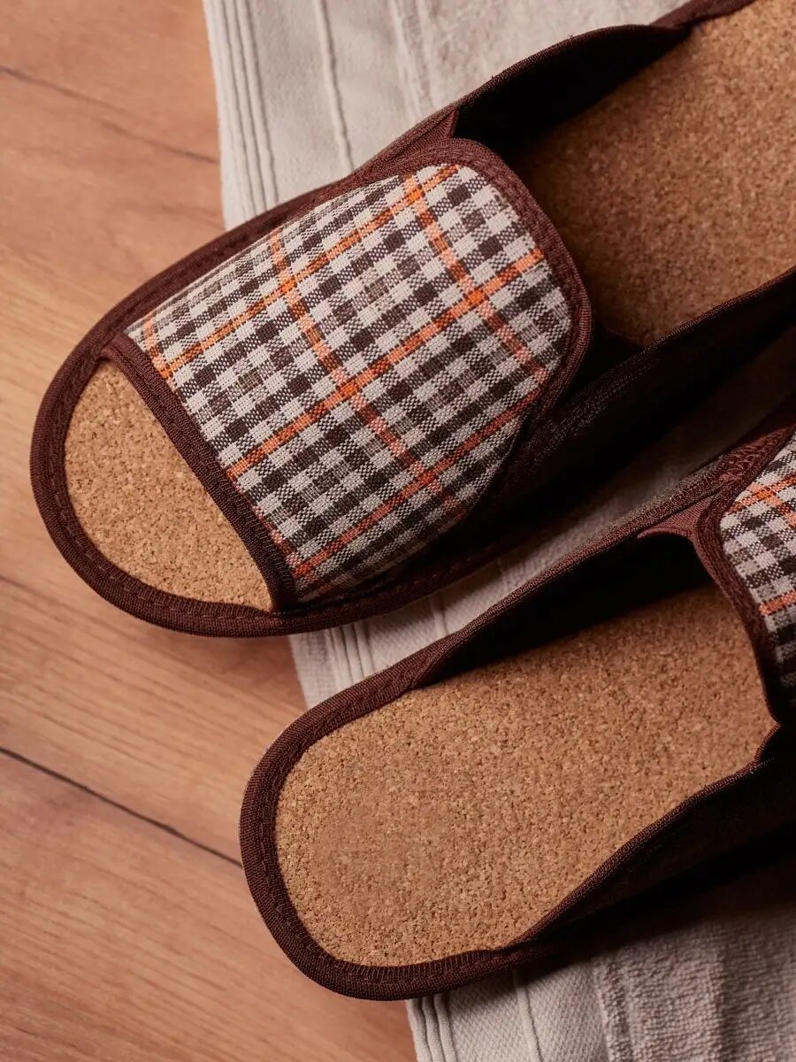 Мужские домашние тапки "LepiloV", открытые, на пробковой стельке, с резинками. Размер 39. Коричневая, рыжая клетка. 400 ₽