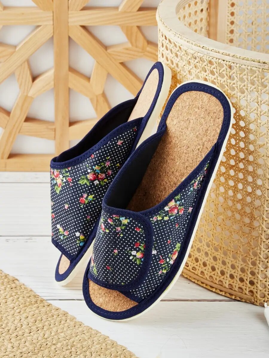 Женские домашние тапочки "LepiloV", открытые, на пробковой стельке и липучке. Размер 39. Синий горох, цветы. 510 ₽