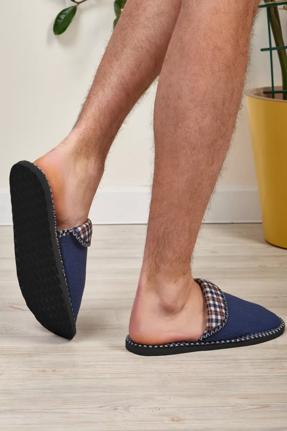 Мужские домашние тапки "LepiloV", закрытые, на текстильной стельке. Размер 45. Чёрный флис клетка сине-коричневая. 580 ₽