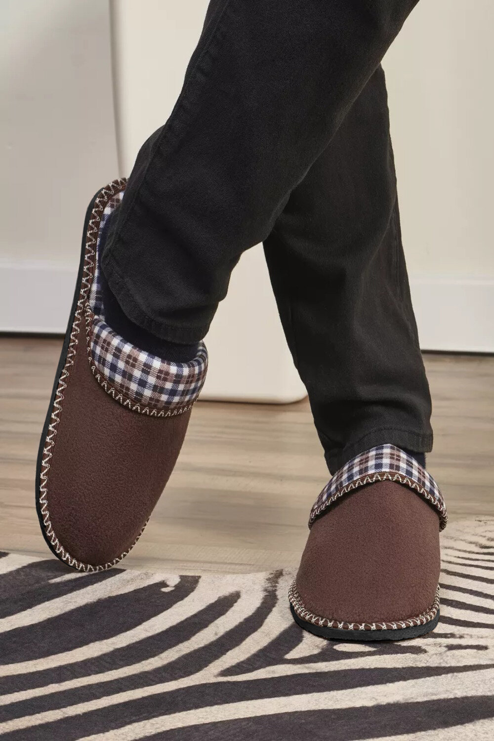 Мужские домашние тапки "LepiloV", закрытые, на текстильной стельке. Размер 45. Коричневый флис клетка сине-коричневая. 580 ₽