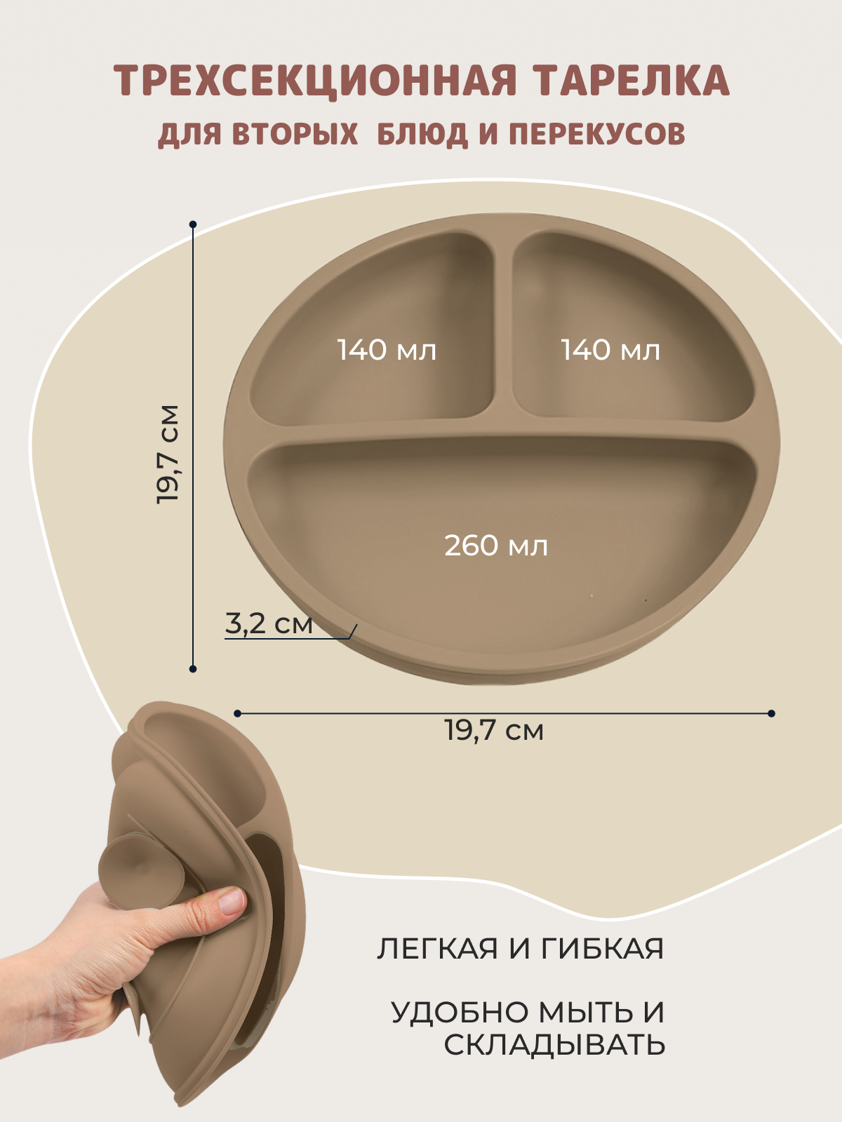 | Особенности | использование в СВЧ, можно мыть в посудомоечной машине, можно стерилизовать, на присоске, нескользящее покрытие, тарелка с секциями |