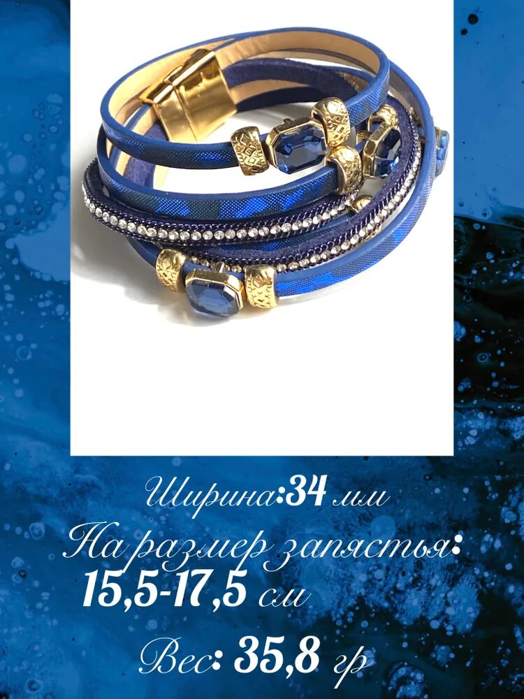 Браслет из экокожи, синий с кристаллами 999 ₽
