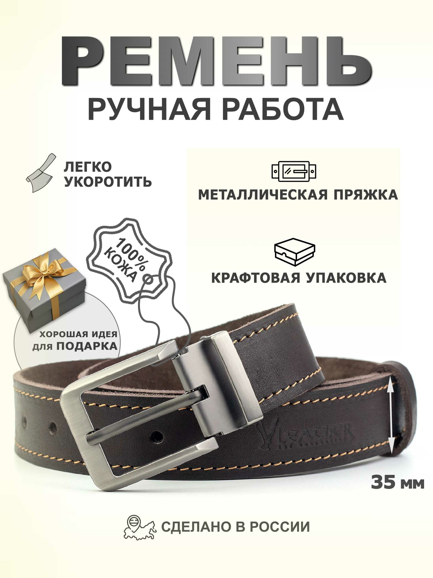 | Комплектация | Ремень из натуральной кожи, крафтовый мешочек |