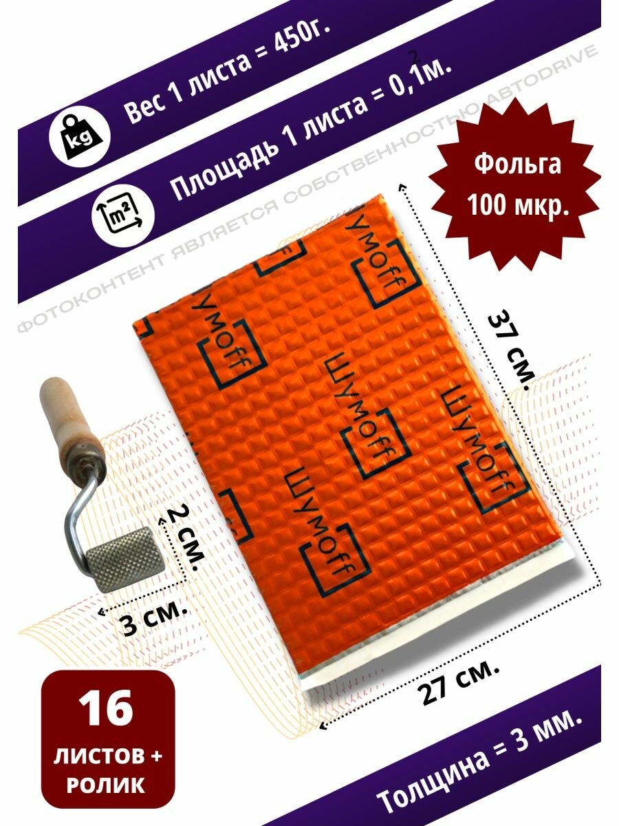 Виброизоляция Шумофф М3 - 16 листов + ролик прикаточный. Виброизоляция авто, вибропласт, вибродемпфер, шумка в машину. Шумоизоляция для дверей, крыши, потолка, капота, арок, пола, багажника. Звукоизоляция в авто 3 мм. 2 574 ₽