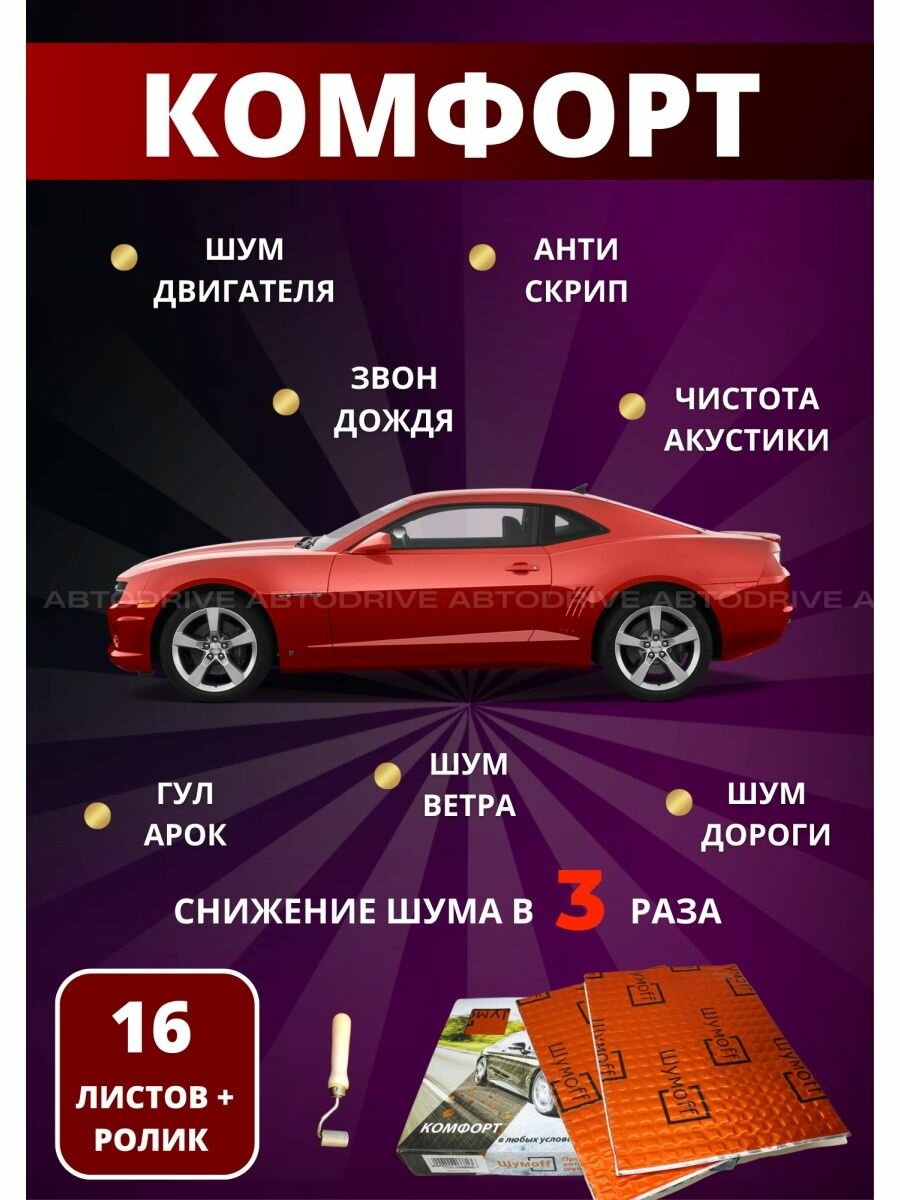 Шумоизоляция для автомобиля Шумофф М3 - 16 листов + ролик прикаточный. Виброизоляция авто, вибропласт, вибродемпфер, шумка в машину. Шумоизоляция для дверей, крыши, потолка, капота, арок, пола, багажника. Звукоизоляция в авто 3 мм. 2 574 ₽