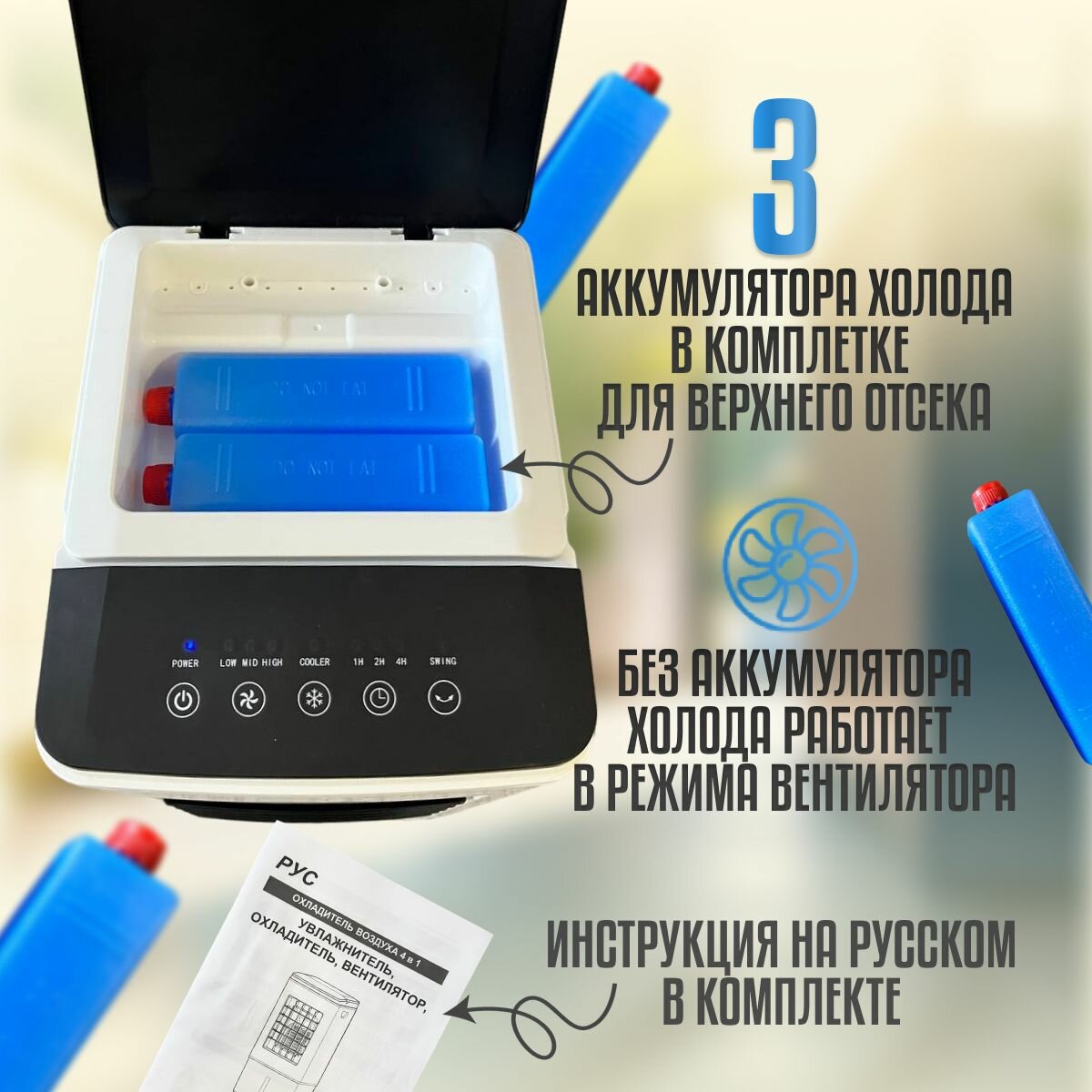 | Подробная комплектация | Мобильный кондиционер - 1 шт., Аккумулятор холода - 3 шт. |