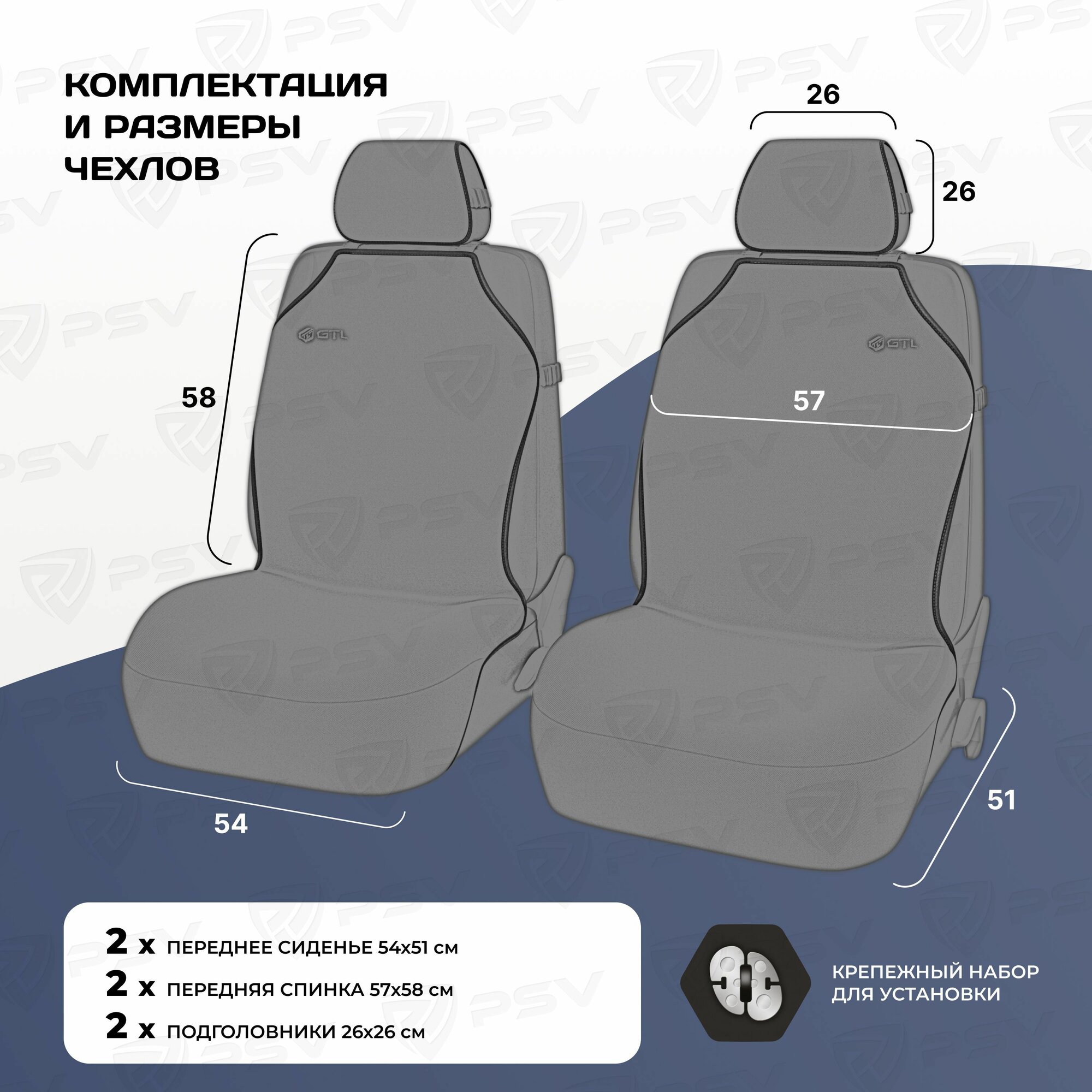 | Подробная комплектация | 2 передних чехла 2 подголовника Крепежный набор для установки |