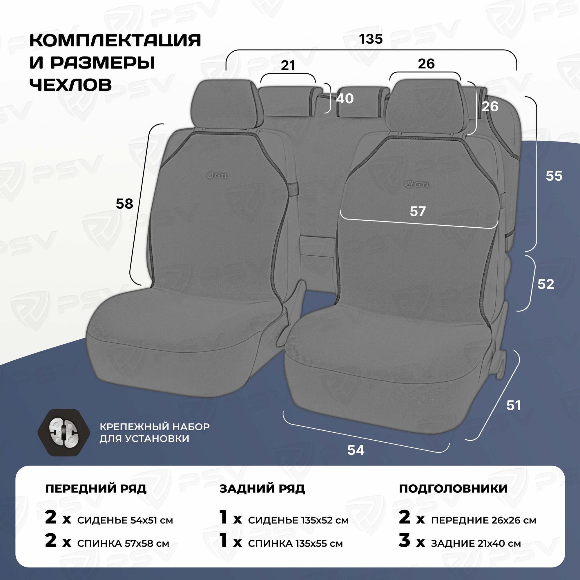 | Подробная комплектация | 2 передних чехла 2 подголовника Крепежный набор для установки |