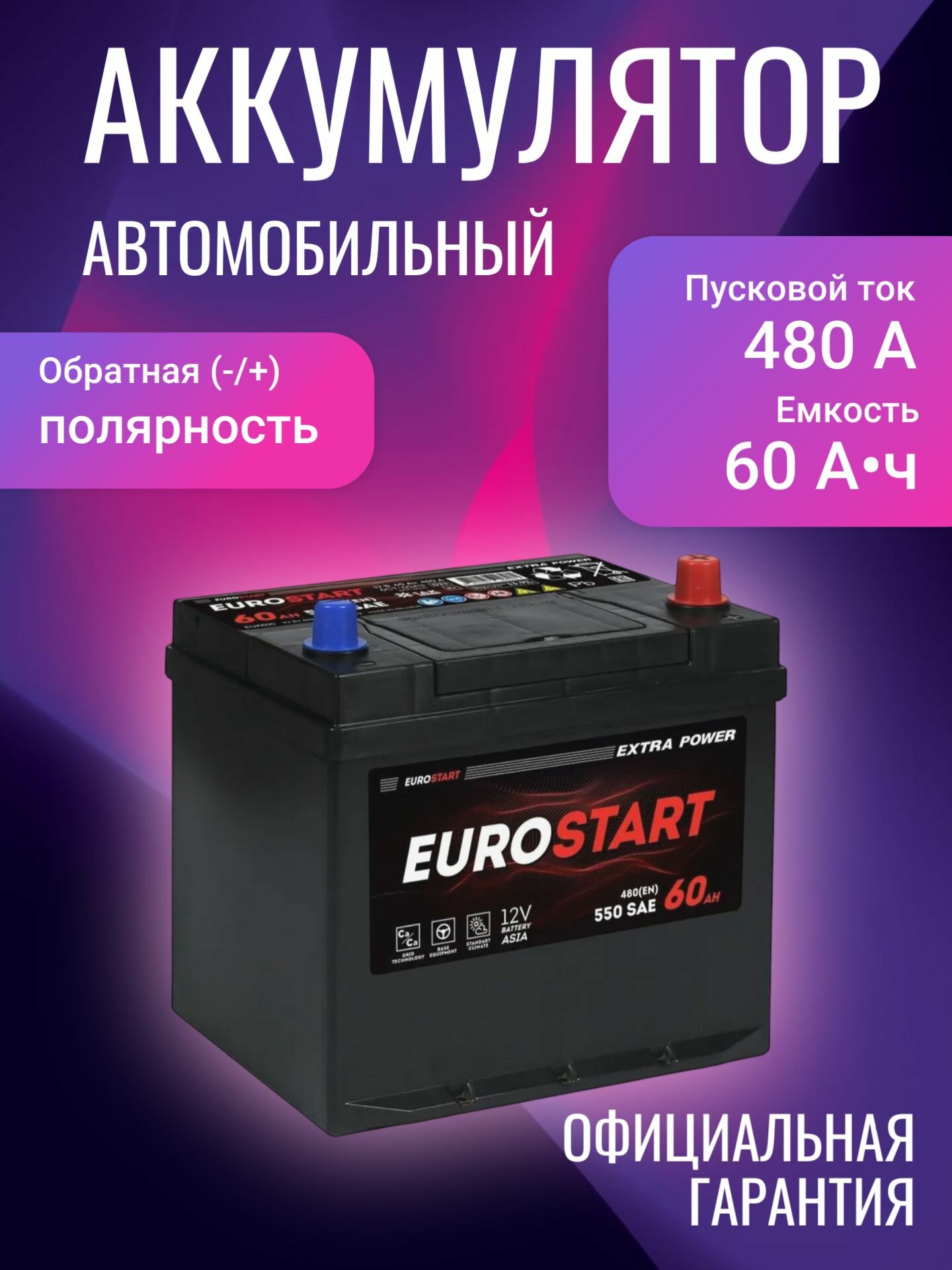 Аккумулятор автомобильный EUROSTART Extra Power ASIA EUA600 12В 60Ач 480А информация: