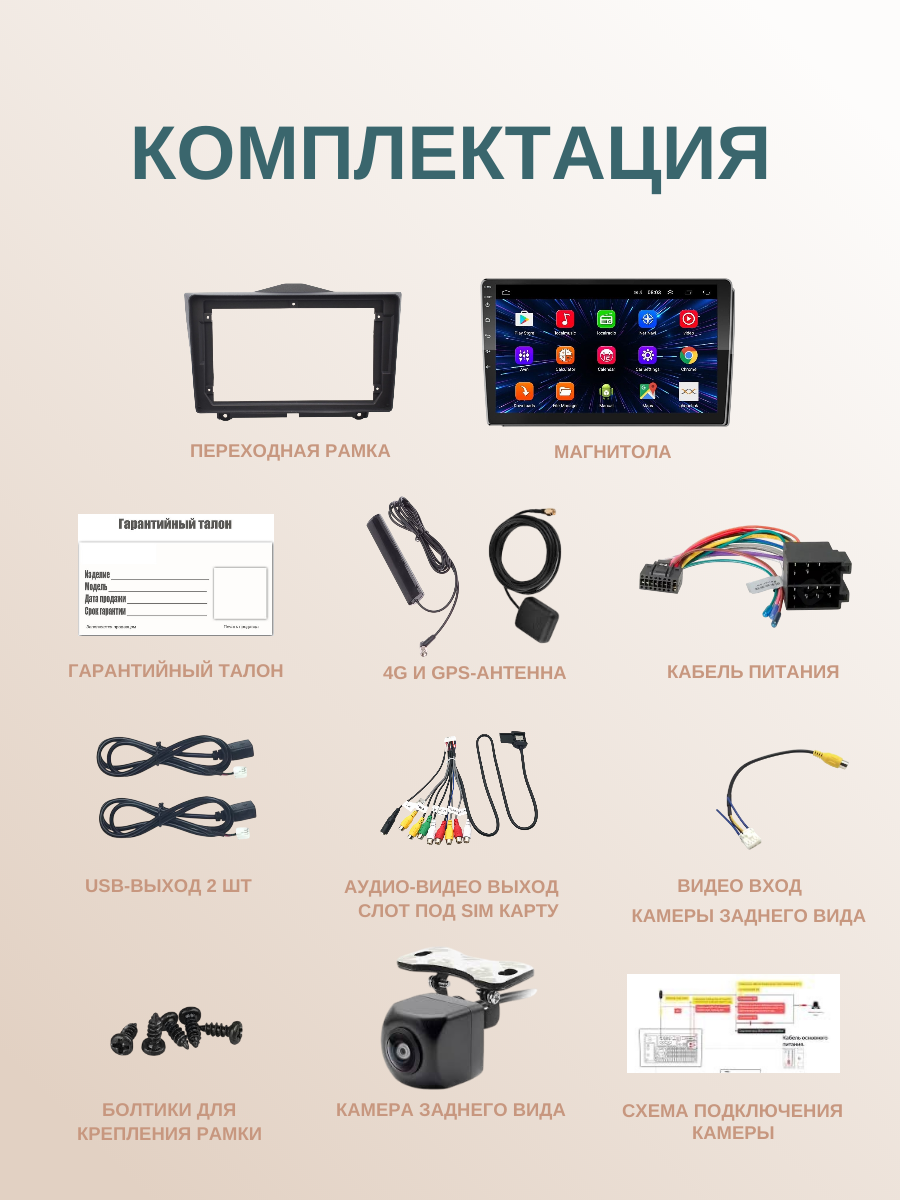 Подробная комплектация | Магнитола, переходная рамка, переходная проводка, подарочная камера AHD720p |