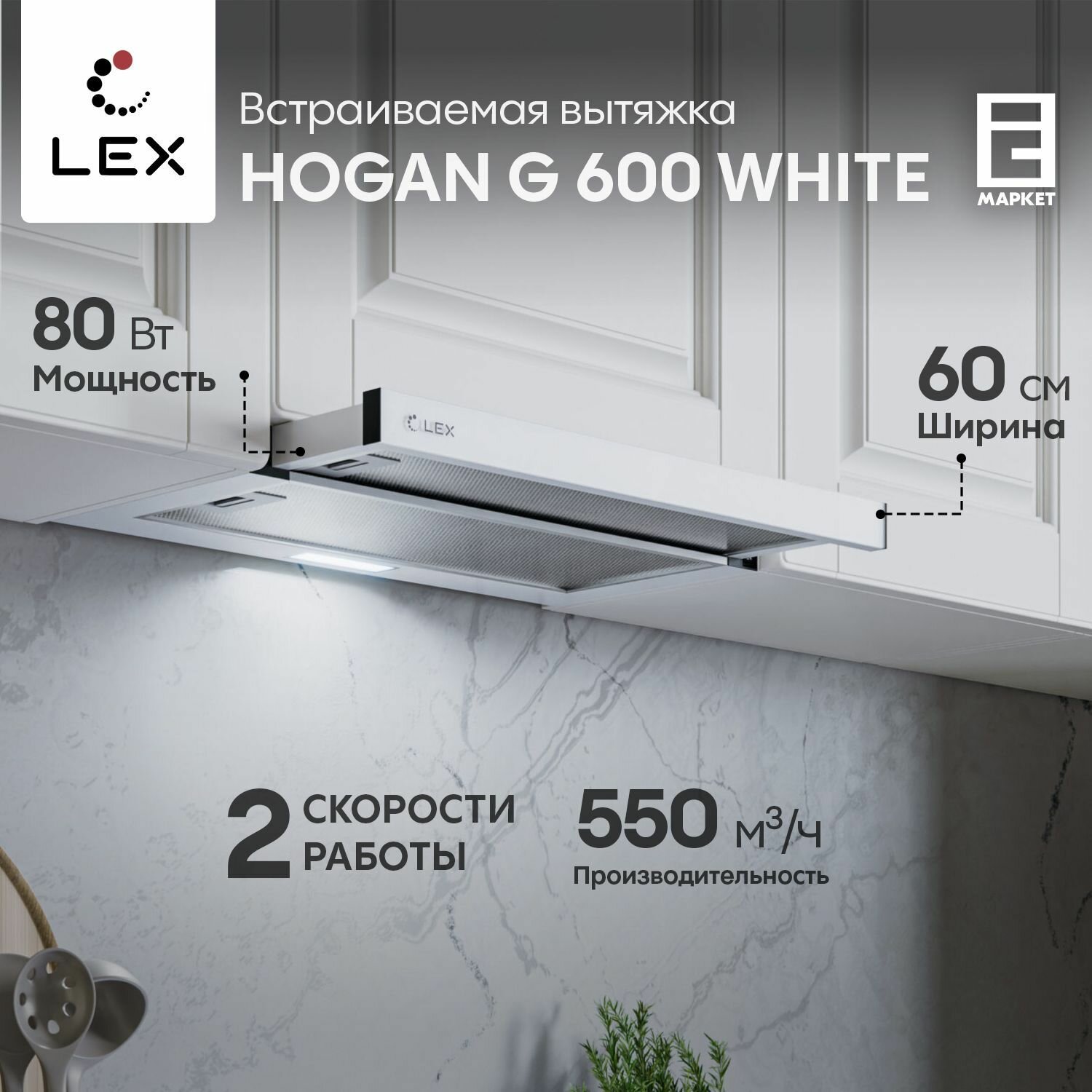 Вытяжка встраиваемая 60 см LEX HOGAN G 600 WHITE, белый / кухонная телескопическая информация: