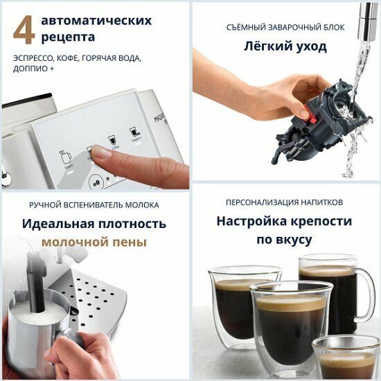 | Дополнительные функции | автоматическая декальцинация / автоотключение при неиспользовании / одновременное приготовление двух чашек / подогрев чашек |