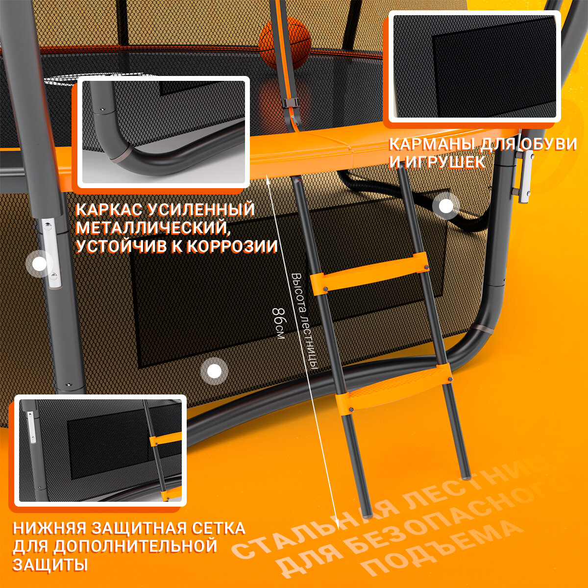 | Особенности | W-образные опоры / баскетбольное кольцо / защита пружин / нижняя защитная сетка / с защитной сеткой / с лестницей / складная конструкция |