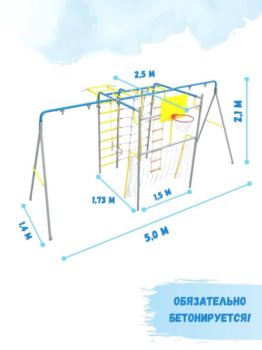 | В комплекте | баскетбольное кольцо, веревочная лестница, ворота, гимнастические кольца, канат, качели, лестница, рукоход, сетка для лазания, турник |