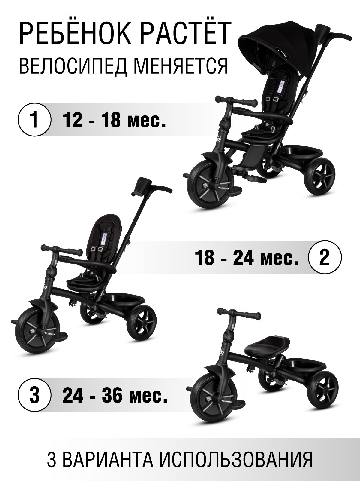 Велосипед детский трехколесный ТМ CITYRIDE XTERRA, складная крыша, колеса EVA 11"/9", поворотное сиденье 360◦, CR-B3-12WT 14 000 ₽