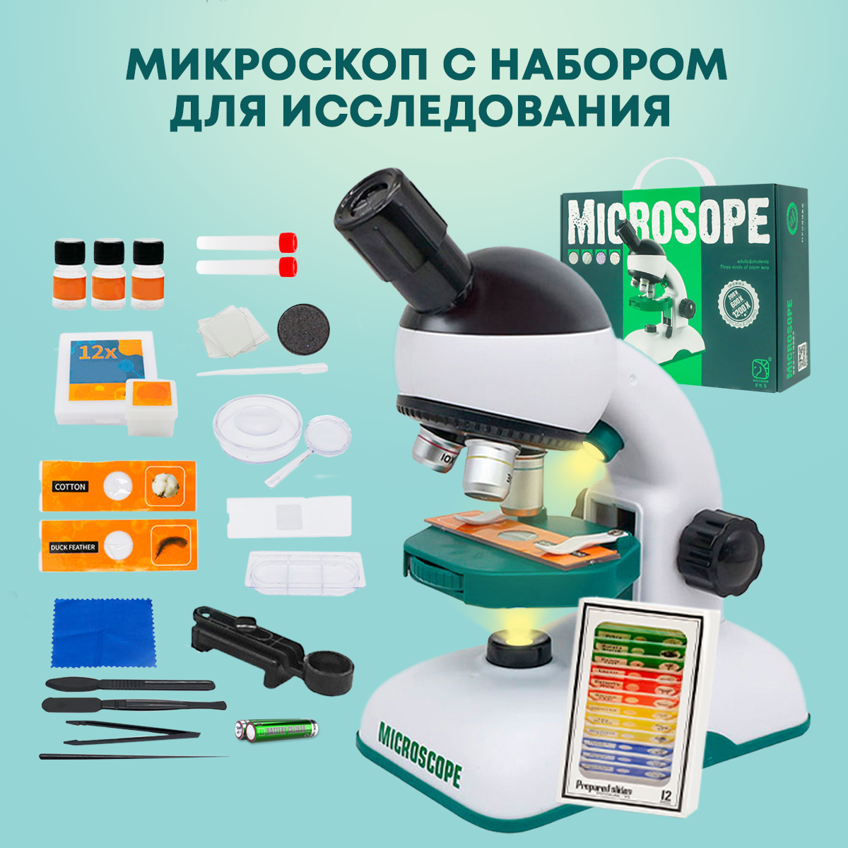 | Комплектация | Микроскоп- 1шт, батарейки - 2шт, пробирки - 2шт, контейнеры, инструменты, инструкция, 2 микропрепарата, 2 предметные стекла |