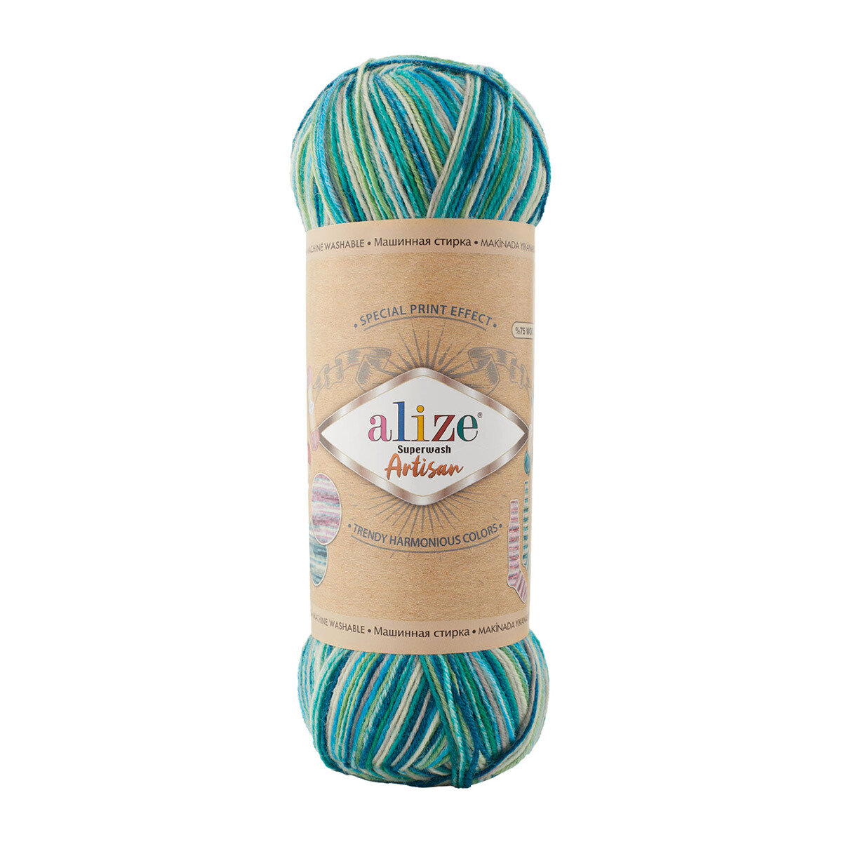 10 цен на Пряжа SUPERWASH ARTISAN ALIZE, зел. бирюза принт - 9001, 75% SW шерсть, 25% полиамид, 5 мотков, 100 г, 420 м.