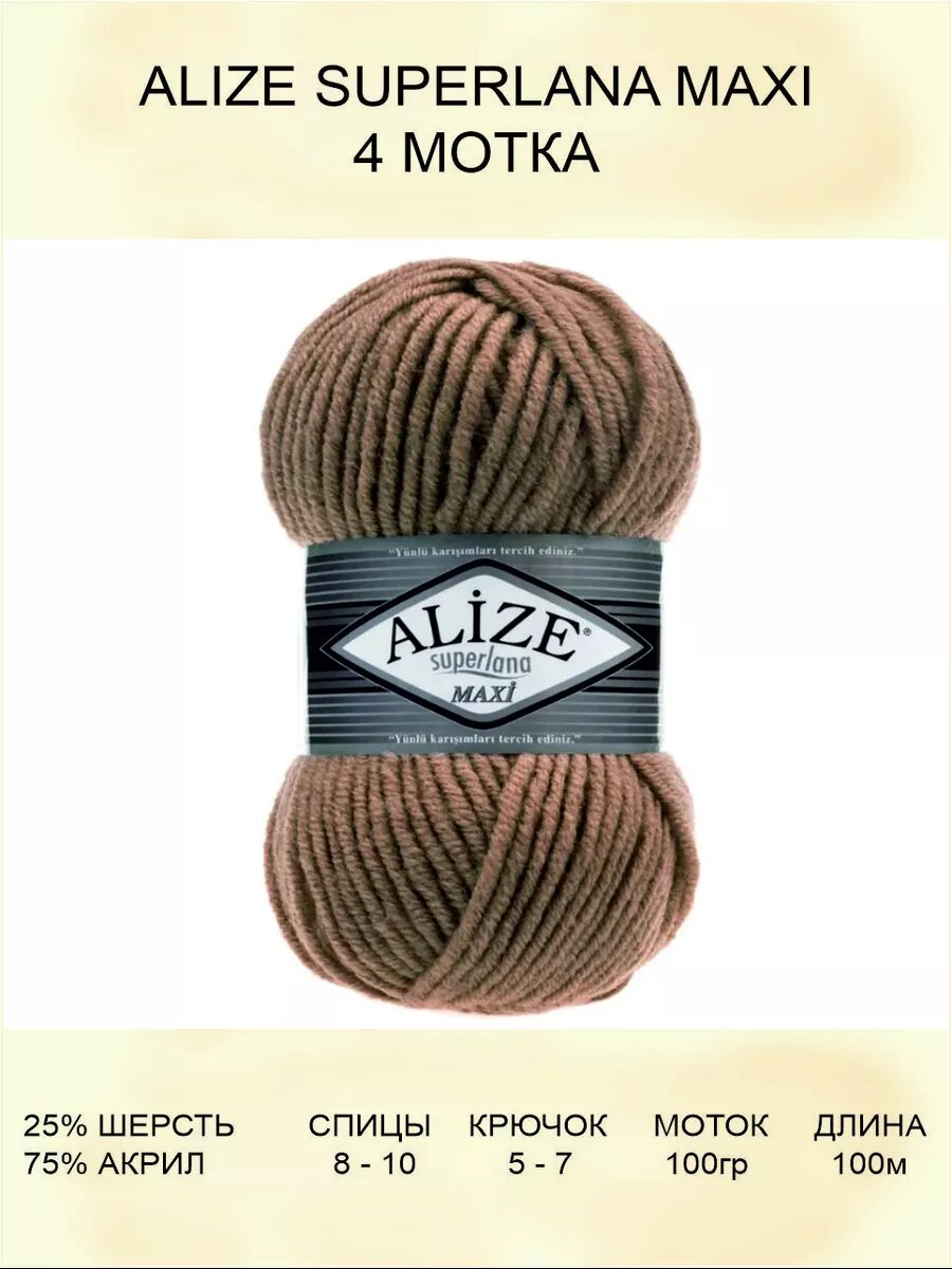 Пряжа ALIZE "Superlana maxi", 100 гр 100 м, 75% акрил, 25% шерсть, ТУ 207 светло-коричневый, 5 шт 1 356 ₽