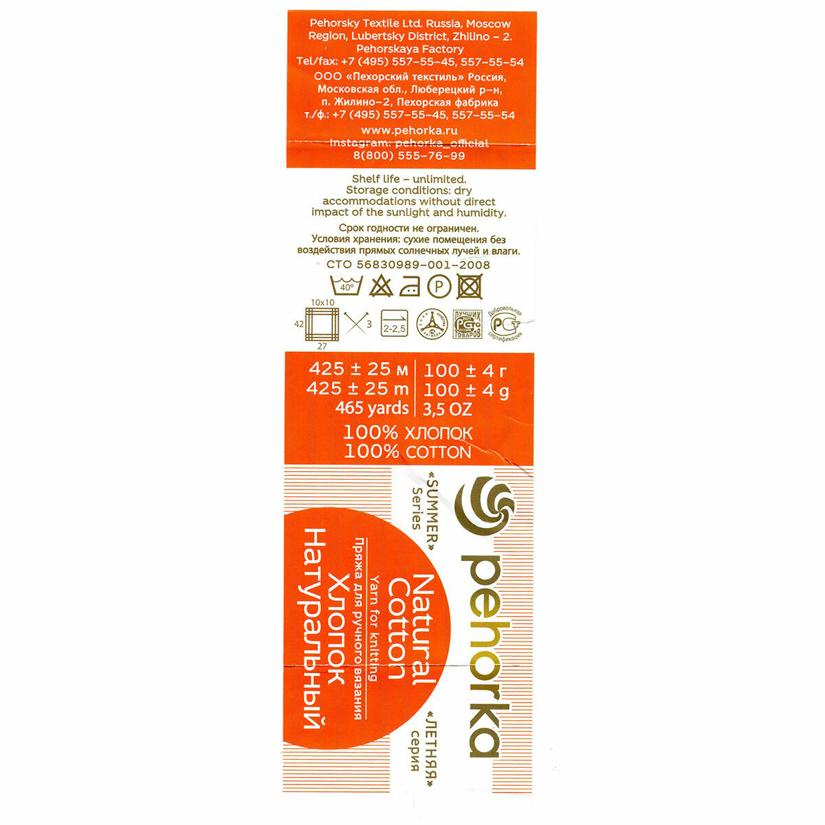 Пряжа Пехорка Хлопок Натуральный, 100 % хлопок, 100 г, 425 м, 1 шт, 59