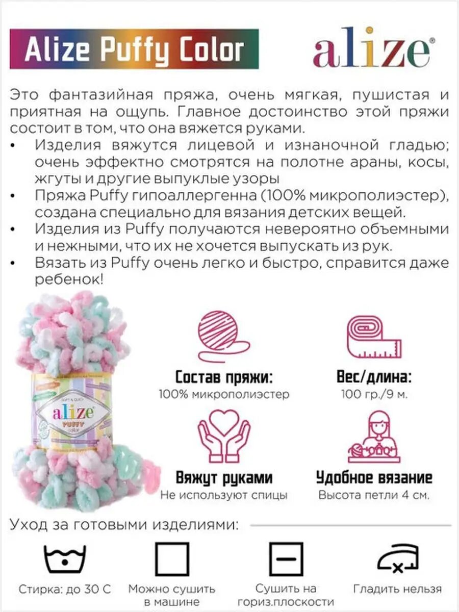Пряжа PUFFY COLOR (Alize), сал/бир/сир/роз - 6526, 100% микрополиэстер, 5 мотков, 100 г, 9 м. 1 441 ₽