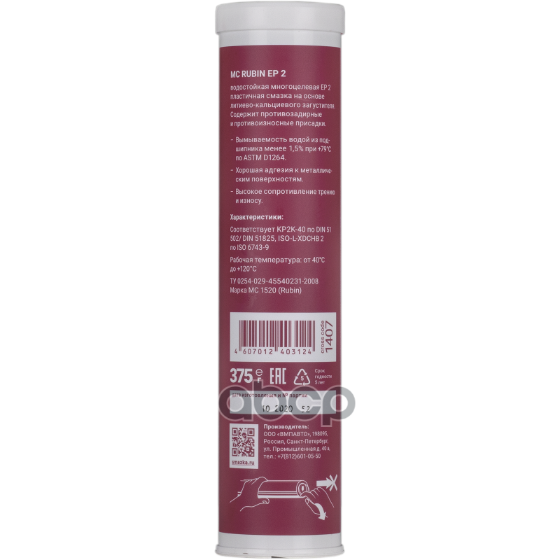 Смазка Мс 1520 Rubin, 375г Картридж ВМПАВТО арт. 1407 информация: