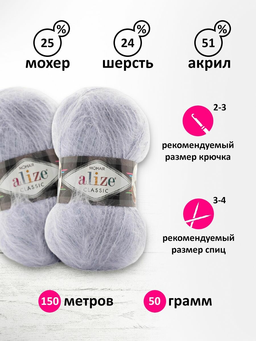 Пряжа для вязания ALIZE 'Mohair classic', 100г, 200м (мохер, шерсть, акрил) (224 светло-сиреневый), 5 мотков информация: