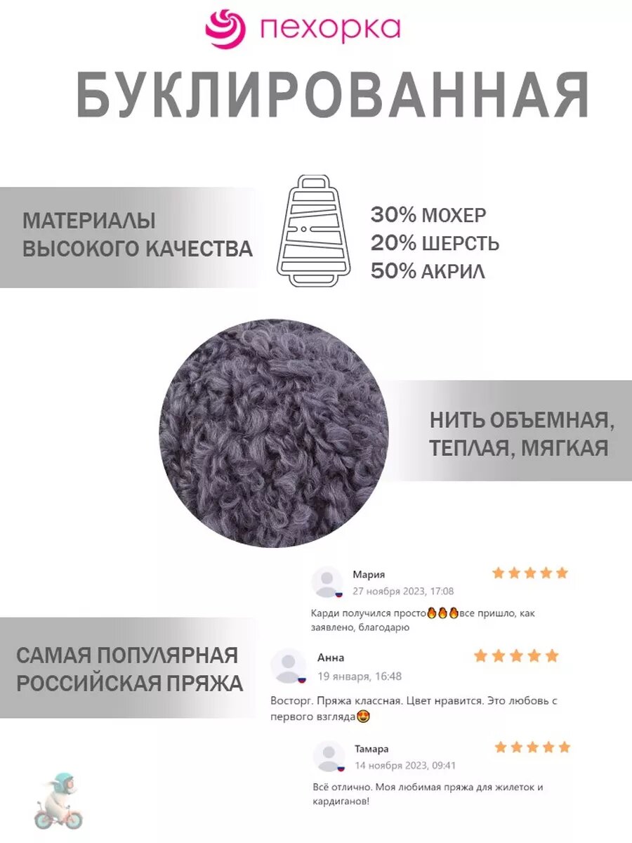 Пряжа Пехорка Буклированная ежевика (191), 30%мохер/20%шерсть/50%акрил, 220м, 200г, 1шт