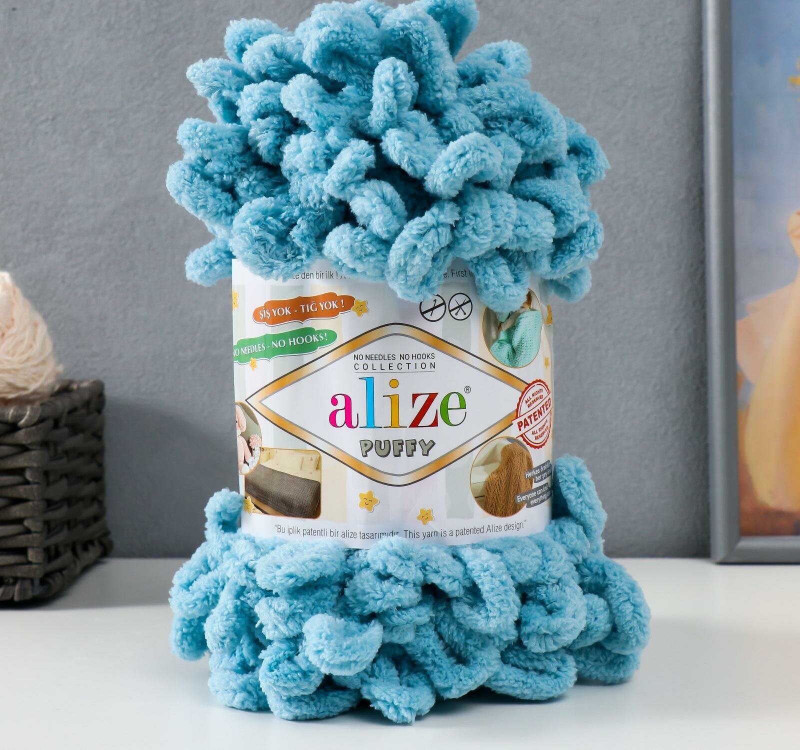 Отзывы на Пряжа плюшевая Alize Puffy (Ализе Пуффи) - 1 моток 414 Лазурный для вязания руками, гипоаллергенная, большие петли (4см), 9м/100г