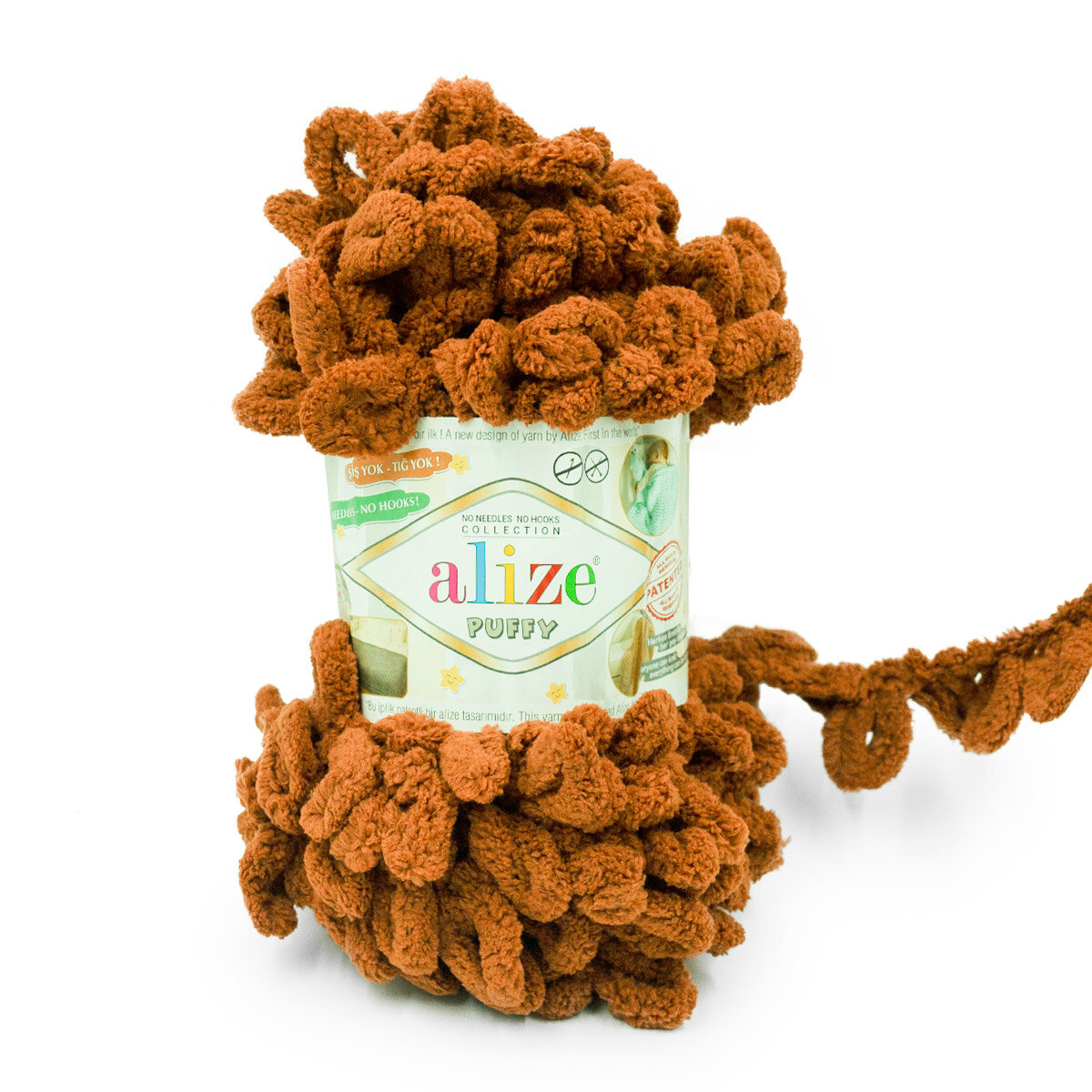 Пряжа плюшевая Alize Puffy (Ализе Пуффи) - 5 мотков 597 корица для вязания руками, гипоаллергенная, большие петли (4см), 9м/100г информация: