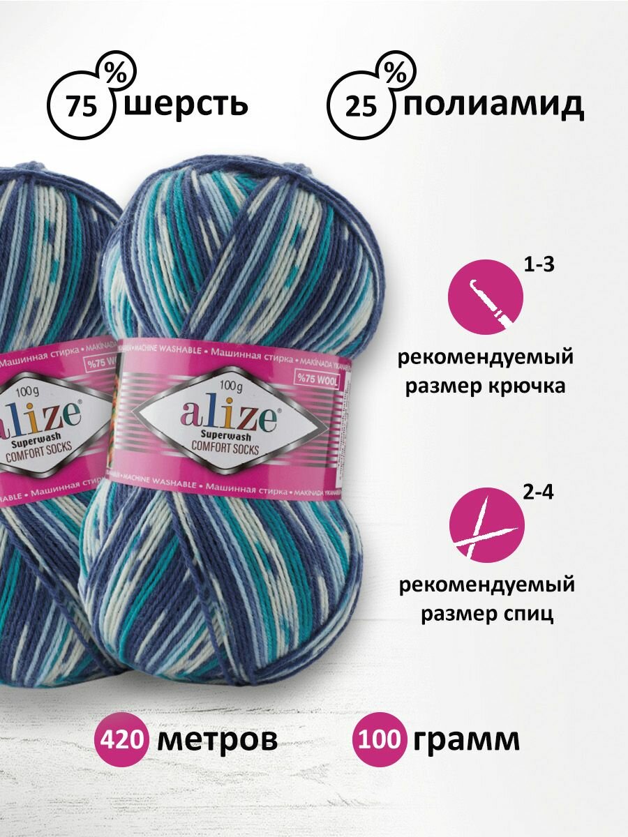 Пряжа для вязания ALIZE 'Superwash Comfort Socks', 100г, 420м (75% SW шерсть, 25% полиамид) (7676 секционный), 5 мотков 2 369 ₽