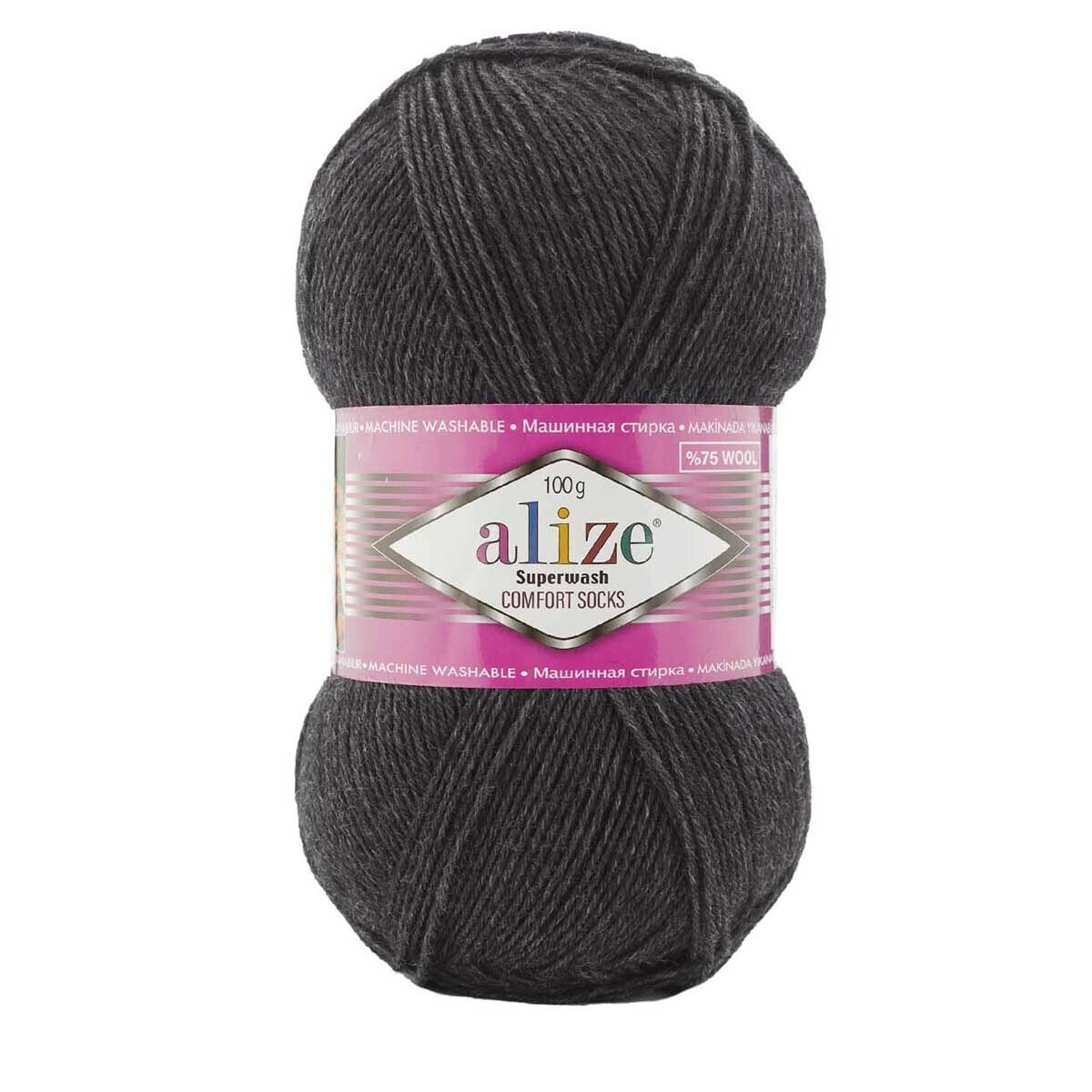 Пряжа для вязания ALIZE 'Superwash Comfort Socks', 100г, 420м (75% SW шерсть, 25% полиамид) (521 антрацит), 5 мотков