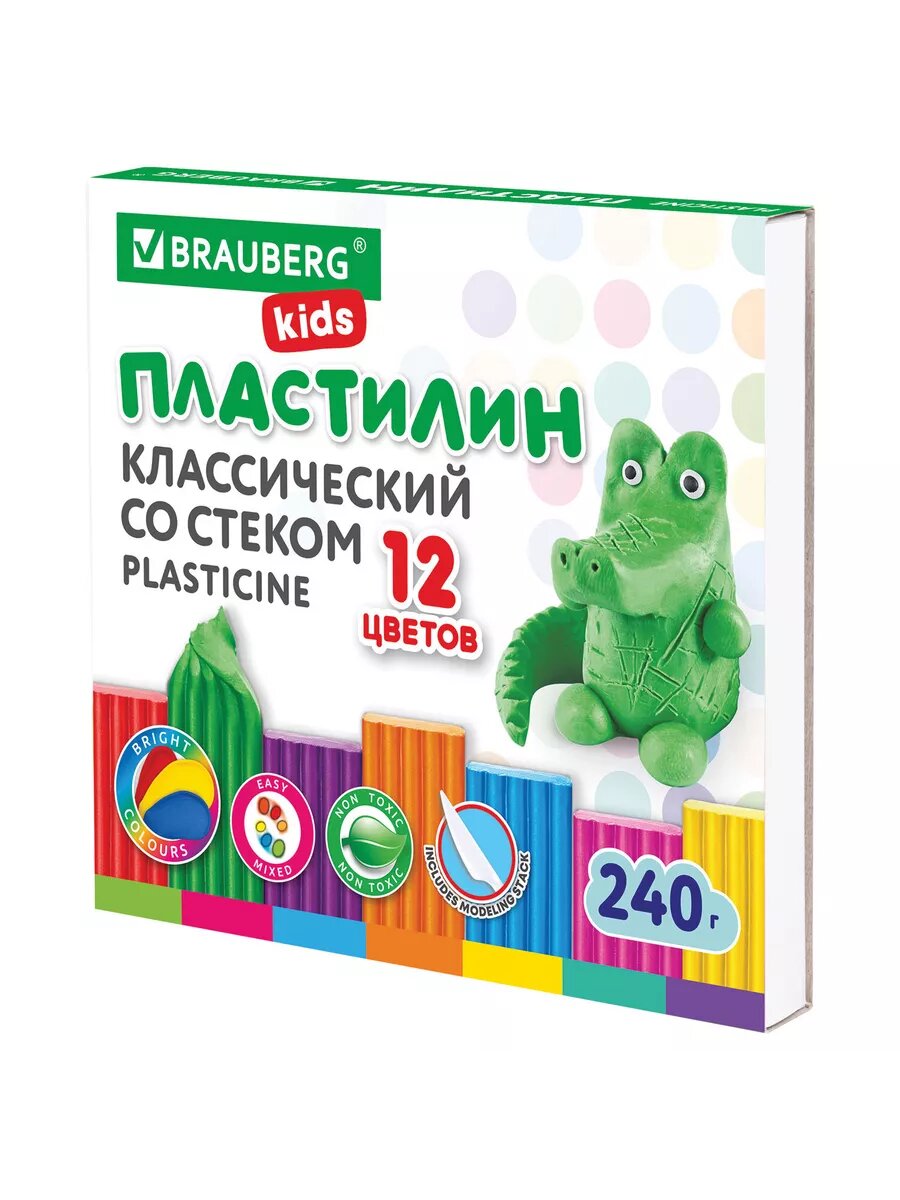 Пластилин Brauberg Kids, классический, со стеком, 12 цветов, доска для лепки формата А4 информация: