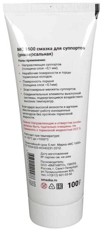 Смазка для суппортов мс 1600 100г туба Вмпавто 1503 информация: