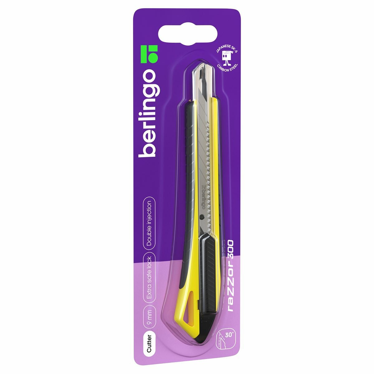 Нож канцелярский 9мм Berlingo Razzor 300, auto-lock, металл. направл, мягкие вставки, желтый, европодвес (BM4131_b) информация: