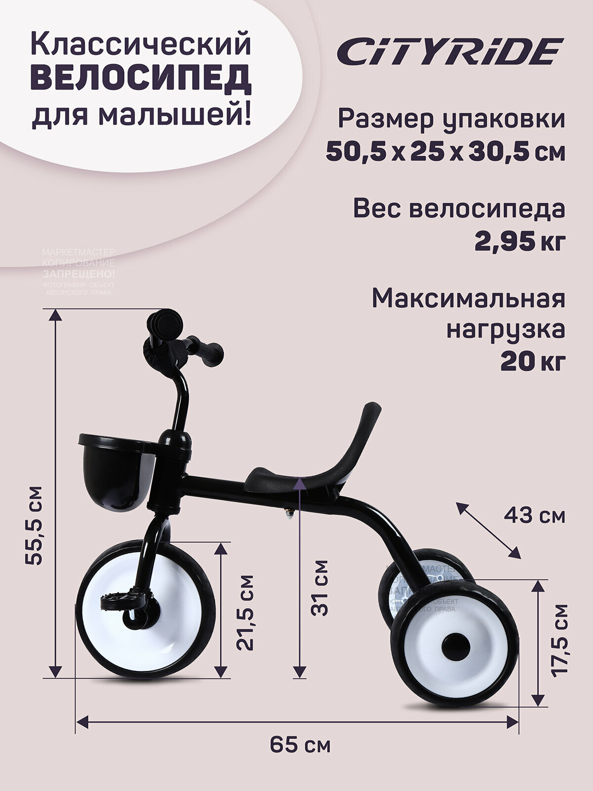 Велосипед детский трехколесный ТМ CITYRIDE, пластиковые колеса 10"/8", корзинка, эргономичное сиденье, CH-B3-00BL