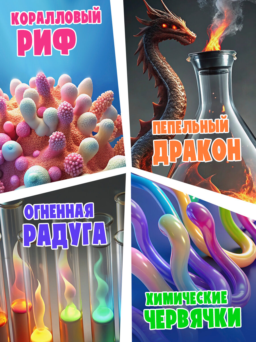 | Комплектация | Набор для опытов, инструкция, коробка, средства защиты, реактивы и лабораторная посуда |