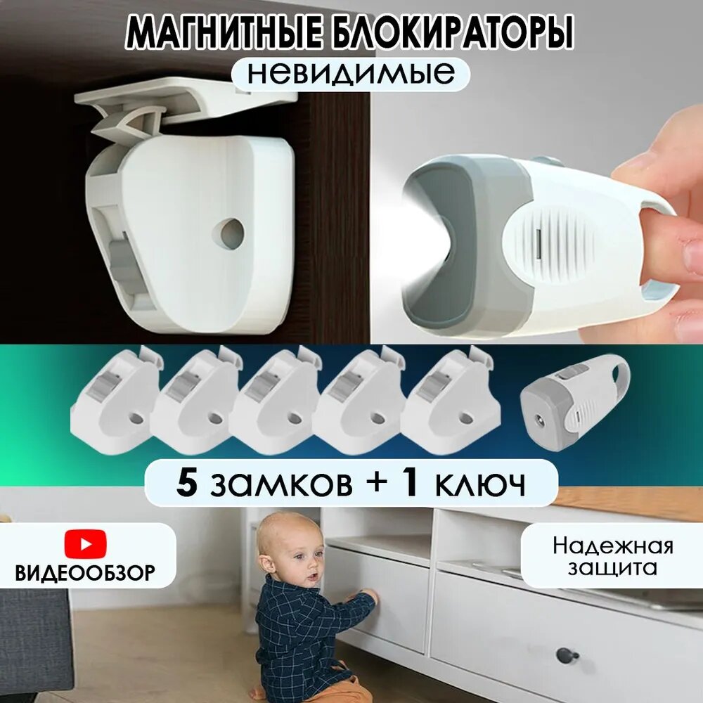 Магнитный блокиратор замок для защиты шкафов и ящиков, 5 замков и 1 ключ информация: