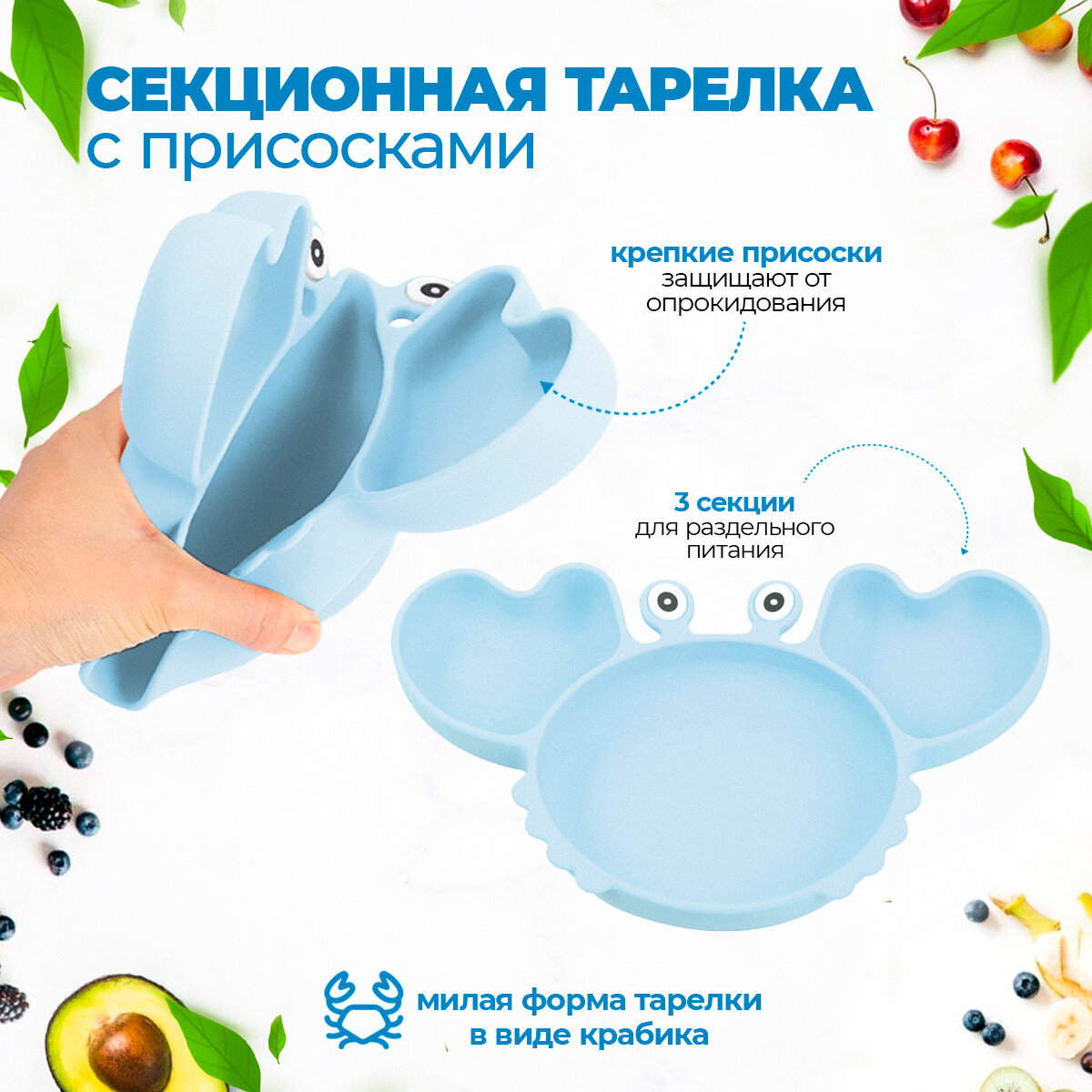 10 цен на Набор детской посуды силиконовый для кормления малыша на присосках, 9 предметов, крабик голубой, для мальчика