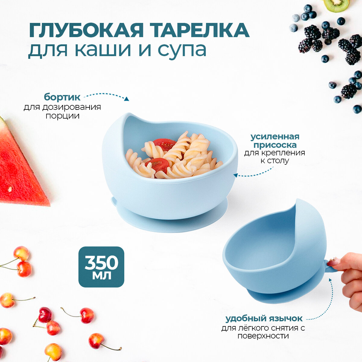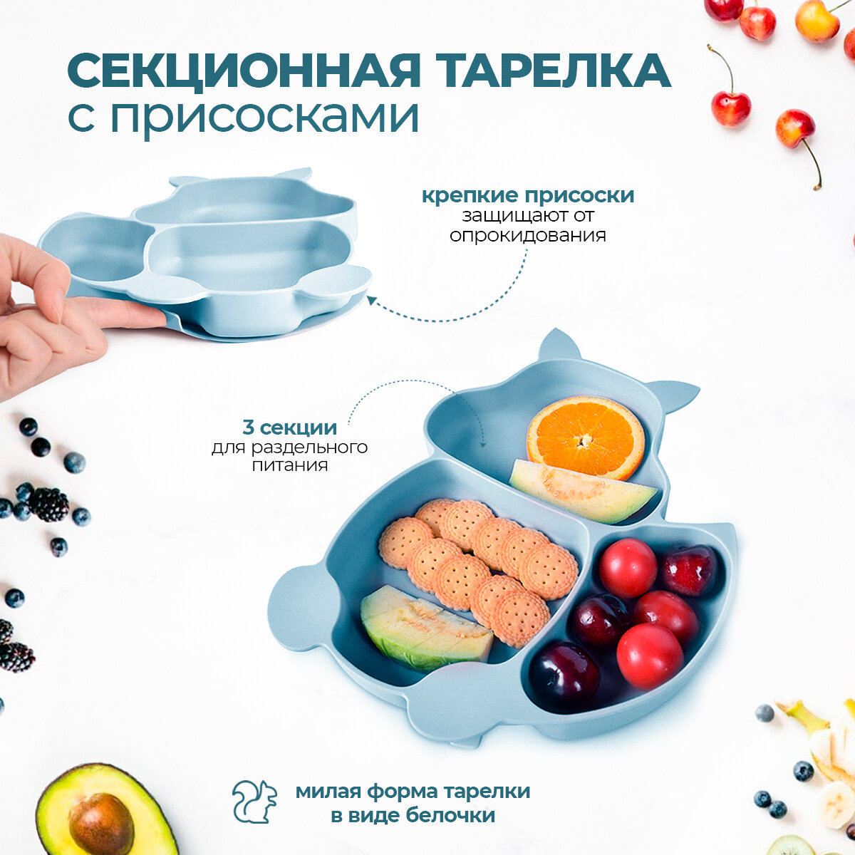 Максимальный силиконовый набор детской посуды для кормления малыша (9 предметов) на присосках, Белочка голубая 1 105 ₽
