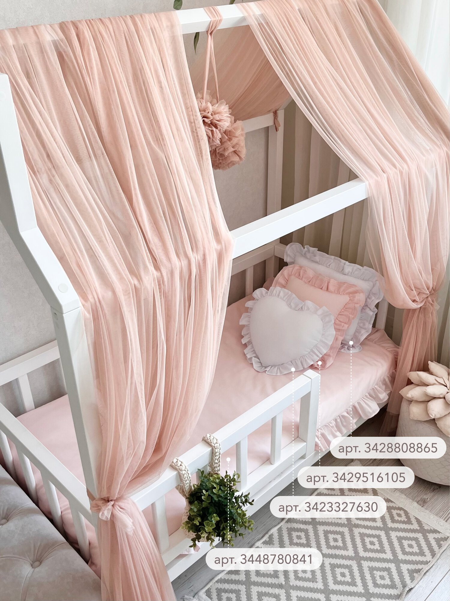 Балдахин на кроватку-домик с помпонами, фатин, пудровый