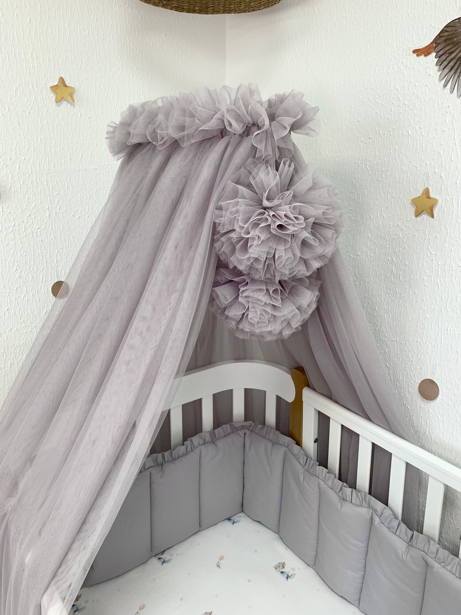 Балдахин на детскую кроватку с помпонами, фатин, серый 2 990 ₽