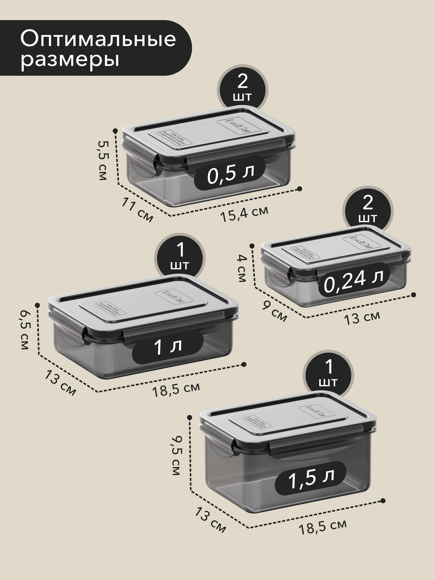 Контейнер для еды герметичный 6 шт LockSar набор контейнеров для хранения продуктов 0,24 л - 2 шт; 0,5 л - 2 шт; 1 л - 1 шт; 1,5 л - 1 шт цвет дымчатый 900 ₽