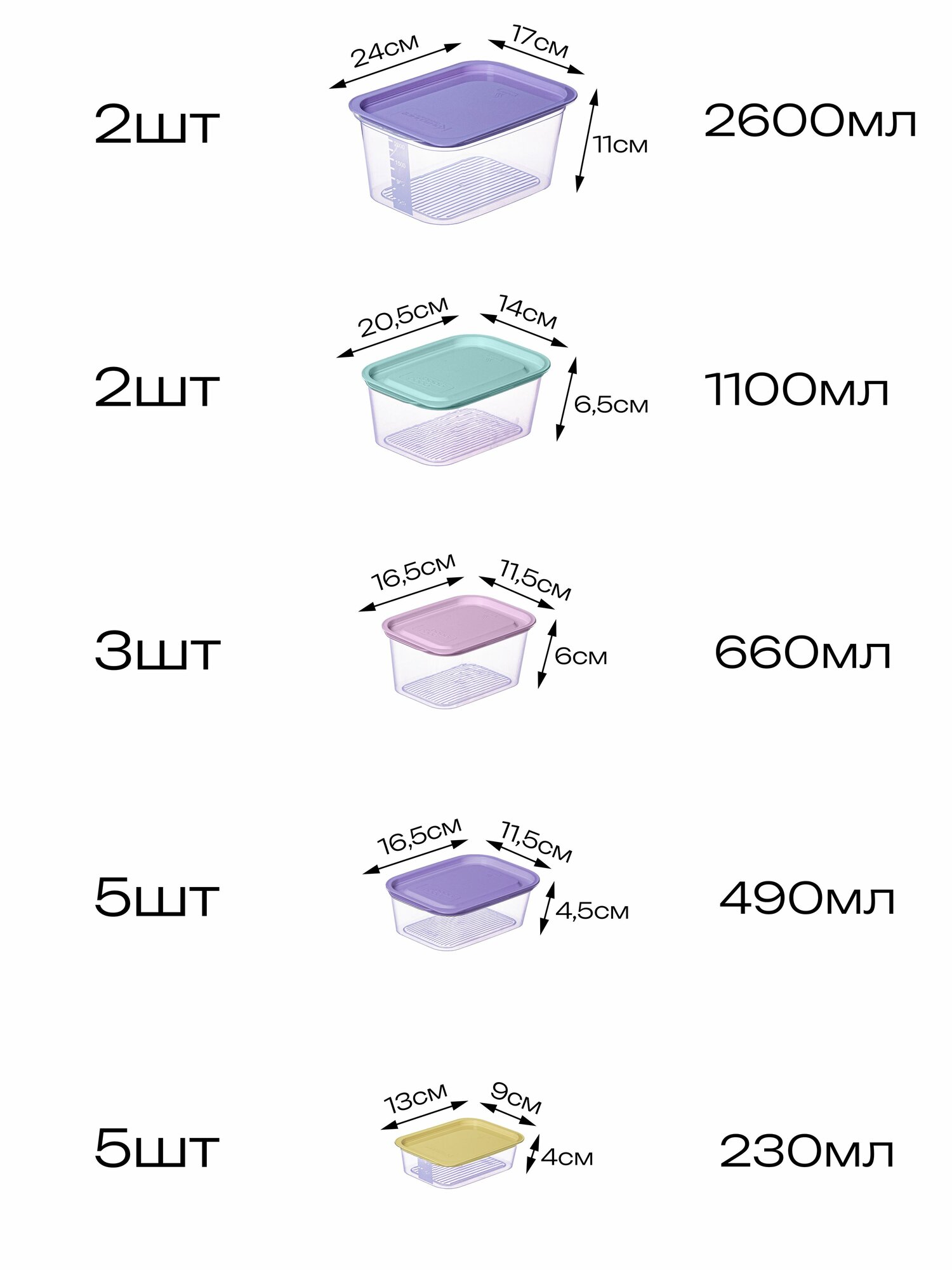 | Комплектация | контейнер 0,23 л - 5 шт; контейнер 0,49 л - 5 шт; контейнер 0,66 л - 3 шт; контейнер 1,1 л - 2 шт; контейнер 2,6 л - 2 шт. |