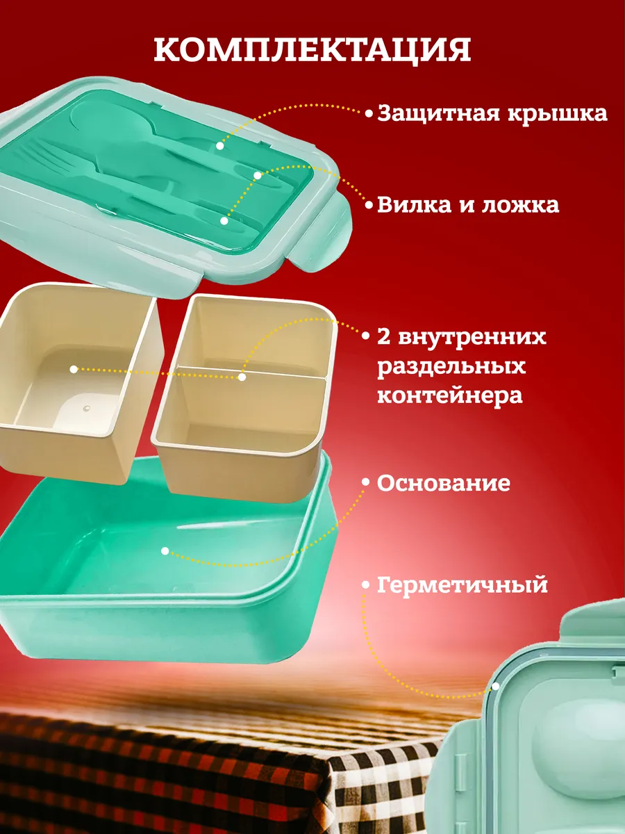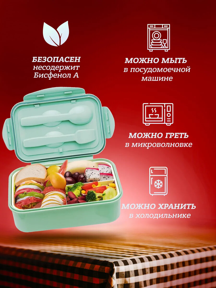 Отзывы на Ланч-бокс Wilker с ложкой и вилкой 1400мл мятный, с отделениями, герметичный контейнер для обедов